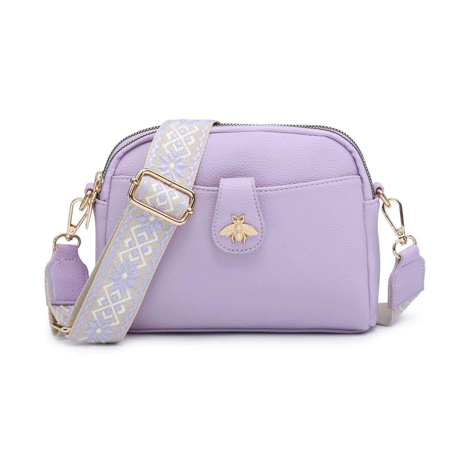 Cross Body Handbag with double zip top sections, front pocket and bee badge with adjustable wide strap .