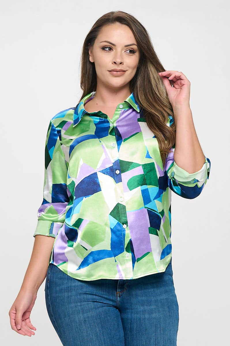 Stretch Satin Printed Full Button Down Collared Blouse with Rollable Long Sleeves